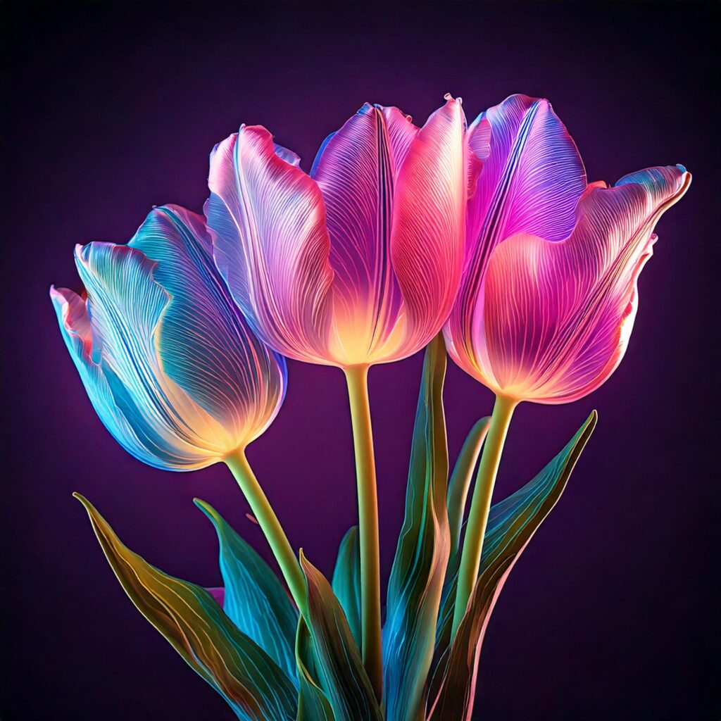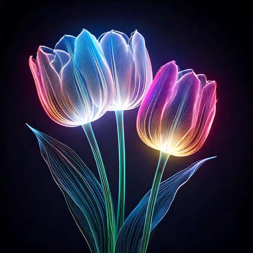 プロンプト:シンプルで様式化されたスケルトンな虹色のチューリップ3本