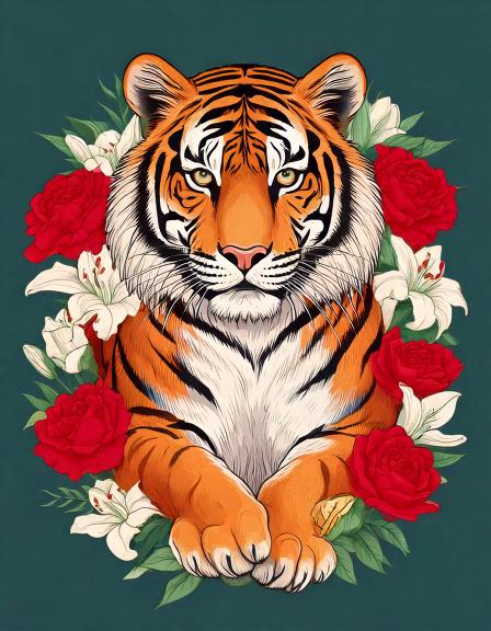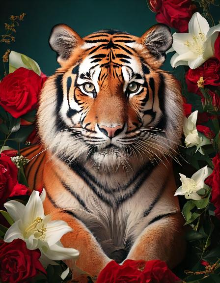 プロンプト:白いユリと赤いバラに囲まれたかっこいい座っている虎