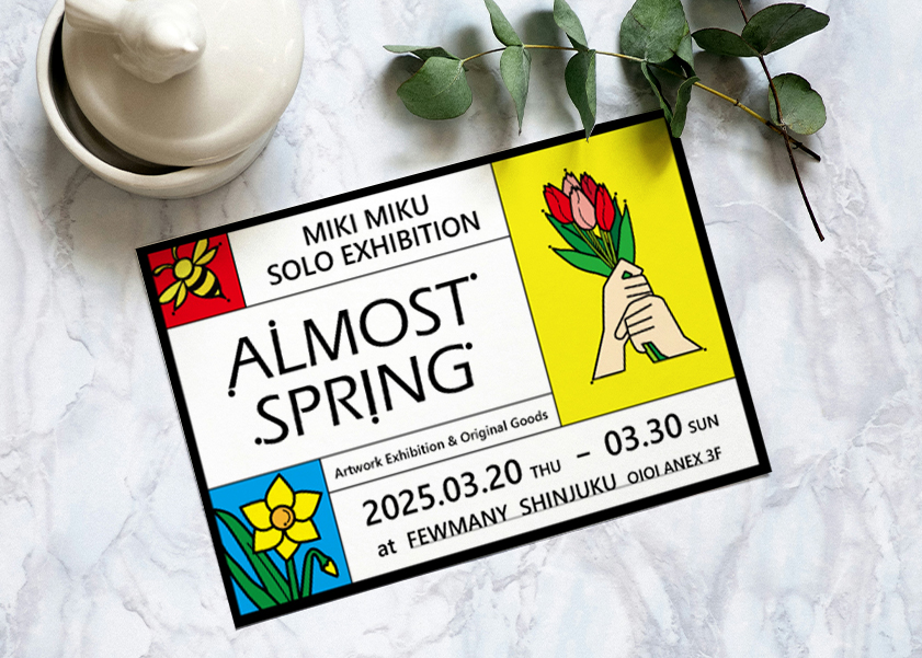 個展のタイトル「ALMOST SPRING」は、シンプルなフォントで退屈にならないよう文字の周りにドットをあしらい、動きが感じられるデザインに仕上げた。