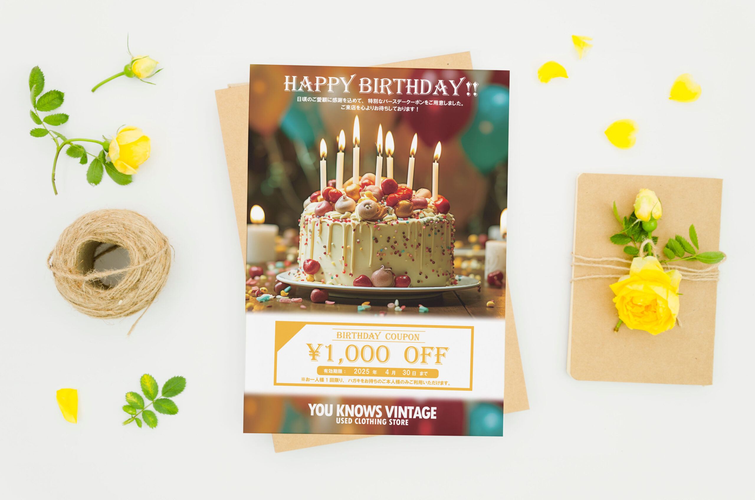 架空の古着屋「YOU KNOWS VINTAGE」が顧客の誕生月に送付するDMとして作成。
