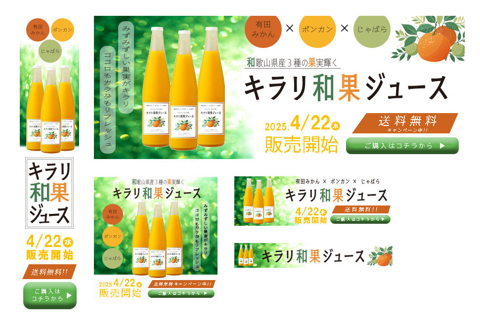 バナーのバリエーション展開は、伝えたい内容の優先順位と、視線の誘導を意識し、「商品→販売日→送料無料→購入ボタン」の順に配置。配色を3色に絞り、協調しつつもアクセントが出るよう意識してデザインしています。