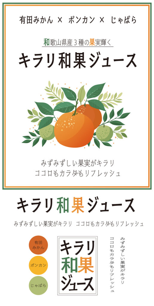 出身地である和歌山県で販売していそうな柑橘系ジュースをイメージして商品をデザインしました。