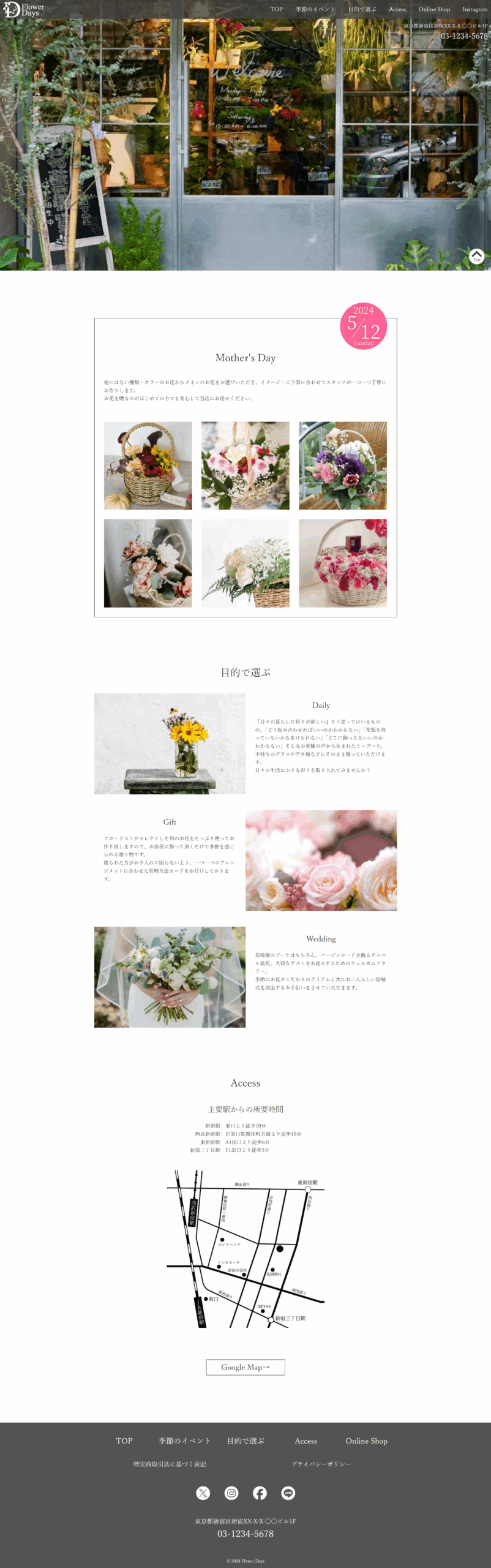 サイトを訪れた人が「実際にお店に行ってみたい」と感じる様に、導入には店舗の外観を大きく取り入れています。イベントページをサイトのメインとし、華やかで上品なアレンジメントの写真を並べて、バリエーションの豊富さや顧客のイメージに合わせた対応ができることをアピールできる配置にしています。